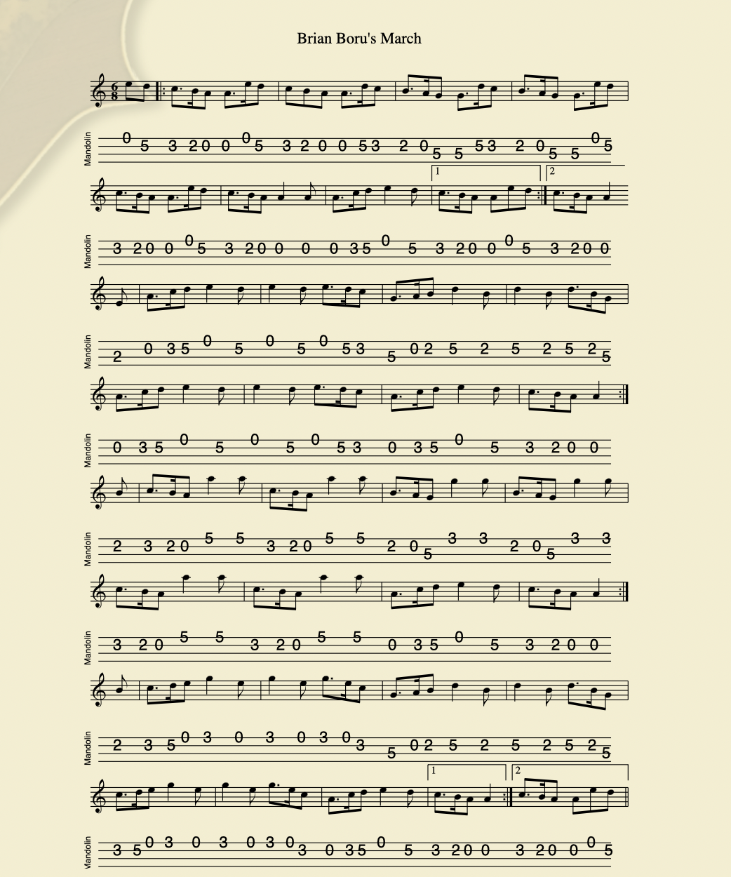 Frank McCollum’s Jig (6/8), D Major. A jig composed – as the name suggests – by Frank McCollum, a composer of many a fine tune, from County Antrim. Mandolin tab here. Listen to me playing Frank McCollum’s on my Belmuse EM-190 electric mandolin.