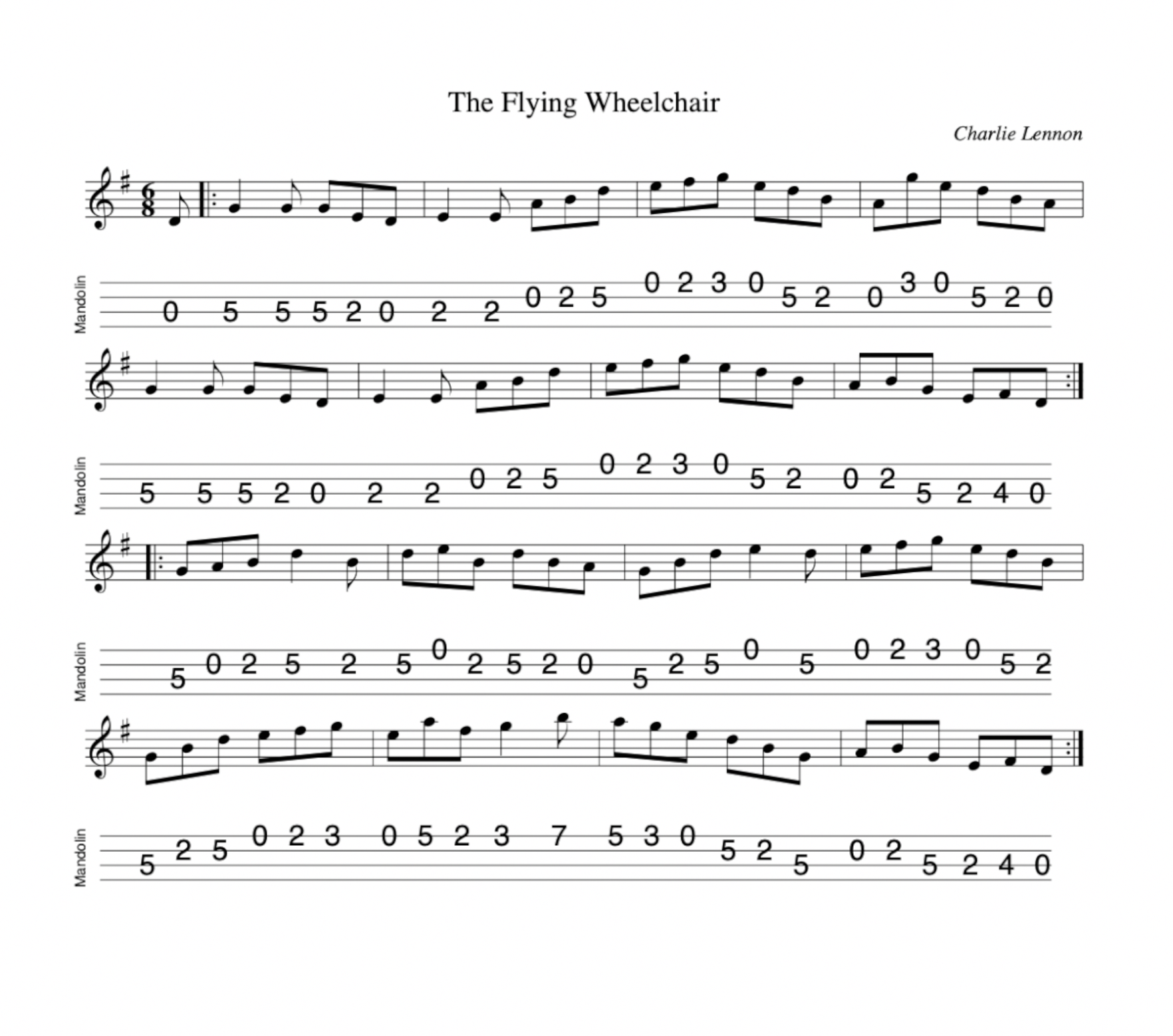 The Flying Wheelchair Jig (6/8), G Major. Composed by Charlie Lennon. I was inspired to add this tune to the collection here after hearing Lawrence Molloy – a mandolinist from Belfast – play his version in a recent YouTube video. (See Lawrence’s video here.) Mandolin tab here. Listen to me playing The Flying Wheelchair on my Revelation Jaguar electric mandolin.