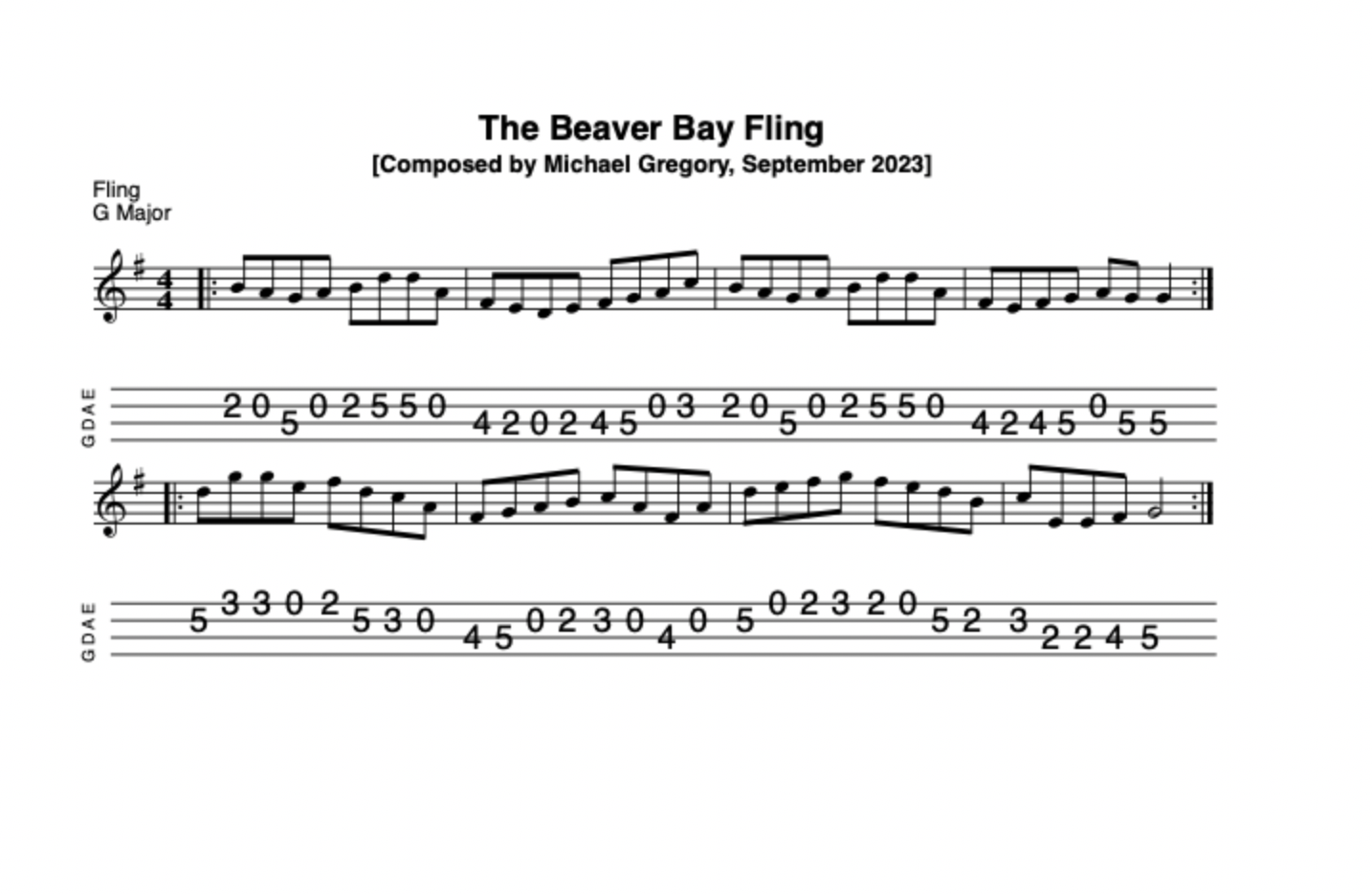 Flaherty’s Hornpipe (4/4), D Major. A lovely hornpipe but beware, it’s not as easy to play as it would appear from a quick scan of the sheet music/tab. Don’t give up. It’s a tune which will reward your efforts to learn it! Further info here. Mandolin tab here. Listen to me playing Flaherty’s Hornpipe on my Kentucky KM1000 mandolin (no repeat). 25 January 2022. Additional sound file. Listen to me playing Flaherty’s Hornpipe on my Paris Swing Macaferri mandolin. 15 August 2022. New version. Listen to me playing Flaherty’s (no repeat) on my Revelation Jaguar electric mandolin.