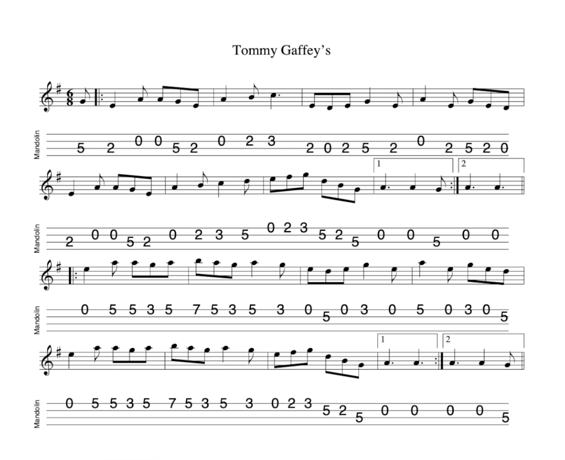 Tommy Gaffey’s Jig (6/8), A Dorian. Mandolin tab here. Listen to me playing Tommy Gaffey’s on my Revelation Jaguar electric mandolin.