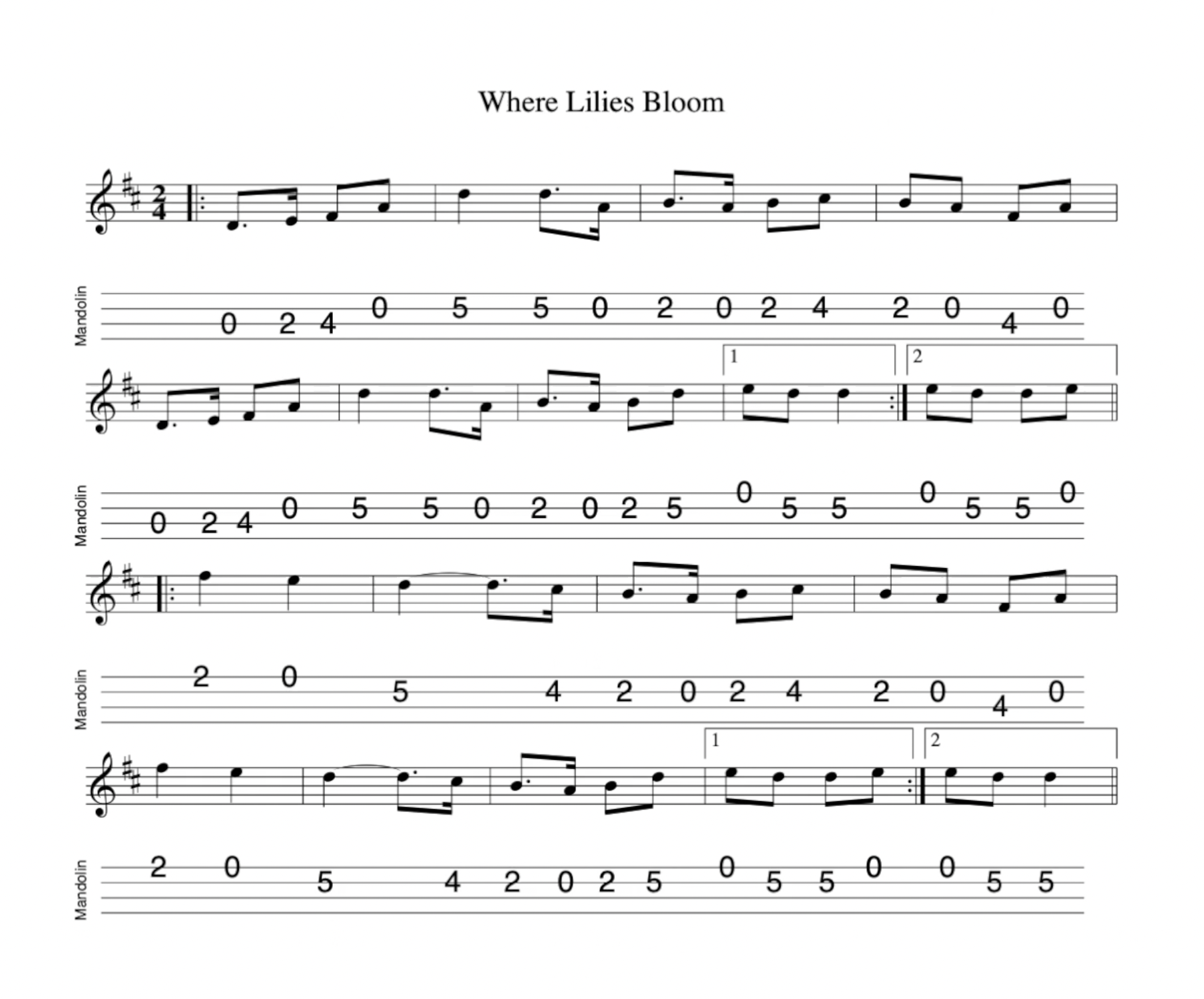 Where Lilies Bloom Polka (2/4), D Major. Mandolin tab here. Listen to me playing Where Lilies Bloom on my Revelation Jaguar electric mandolin.