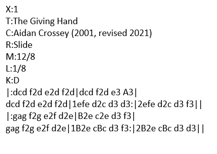 The Giving Hand is a slide in D Major. The title is inspired by one of Brendan Behan’s favourite sayings, “May the giving hand never falter!”. Mandolin tab and sheet music here. Listen to me play The Giving Hand on my G&O #34 mandolin. ABC below:
