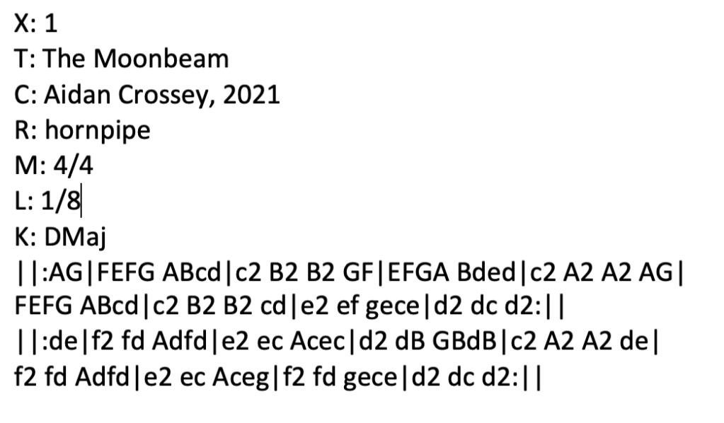 Added 22 November 2021. I was woken up a few nights ago with the bedroom flooded in an intense white light from a bright, almost-full moon. The memory came back to me as I was working on this hornpipe – my latest composition. And so it’s eventual name – The Moonbeam – suggested itself. Mandolin tab and sheet music here. Listen to me playing The Moonbeam on my Paris Swing Macaferri mandolin. Listen to me playing The Moonbeam on my Ashbury AT-40 tenor guitar. ABC below. 30 May 2022. New version. Listen to me playing The Moonbeam on my Revelation Jaguar electric mandolin.