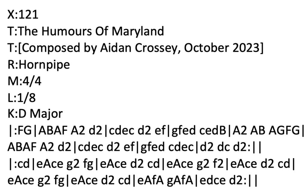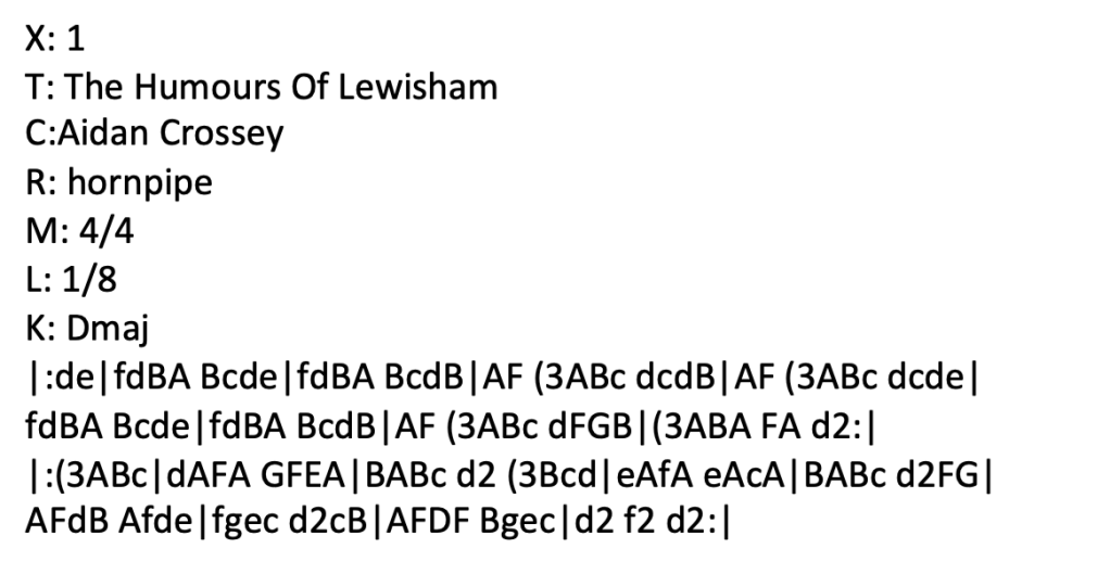 Added 7 December 2021. Many years ago – late 1990s/early 200os, I can’t quite remember exactly – I made a mixtape as a Christmas present for friends which I called The Humours Of Lewisham. Some time later I got a notion to make some recordings of my own musical output and the first home-produced CD which I put together was called “The Humours Of Lewisham, Volume 2”. I followed it up afterwards with “The Humours Of Lewisham, Volume 3”. At the time I made Volume 2 I was bitten by the composing bug and was churning out a rake of tunes – many of which were fairly mediocre if I’m being perfectly honest. However one or two have remained with me over the years, including this hornpipe in D Major called – you’ve guessed it! – The Humours Of Lewisham. Now – 20+ years later – I’ve got around to recording it. Mandolin tab and sheet music here. Listen to me playing The Humours Of Lewisham on my Paris Swing Macaferri mandolin. Listen to me playing The Humours Of Lewisham on my Ashbury AT-40 tenor guitar. ABC below: