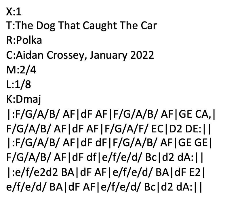 Added 10 January 2022. I was working on a polka (hence the term polka in the ABC below) which I figured would work better at slower tempo as a 2/4 march, originally in G Major. It was tricky to play and I decided to change it down to D Major. It worked better in that key but it was still somewhat tricky to play. Is it a decent tune or not, if it doesn’t fall easily under the fingers? Hmmm… Anyway, there’s a phrase that colourfully captures the essence of a Pyrrhic victory which seemed to fit this tune perfectly. The Dog That Caught The Car. Having spent considerable time “catching the car” (i.e. writing this tune), the dog (i.e. me) doesn’t really have the ability to do a great deal with the prey! (Hence the reason that in my rendition below, I play the tune once only with no repeat… and feel thankful that I managed to get through it once without any major flubs!) Mandolin tab here. Listen to me playing The Dog That Caught The Car (no repeat) on my Paris Swing Macaferri mandolin. ABC below (NB the polka term has been superseded):