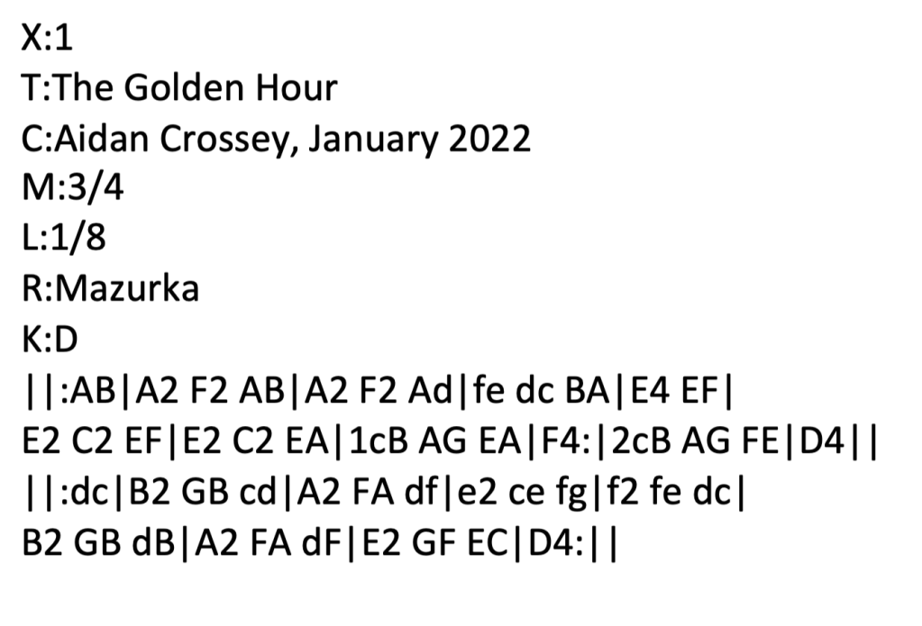 Added 11 January 2022. I have my partner, Fee, to thank for the title of this mazurka. She introduced me to the concept of “the golden hour” – that time of the evening when, as the sun begins to approach the horizon, the light takes on a golden tinge which in turn gives the impression of soft focus… We have spent many a golden hour on holiday or at home in summer evenings winding down with a few drinks. And so, on this dank and misty morning as this sprightly tune came to me, the title The Golden Hour seemed fitting. I recorded the tune within minutes of writing it, so my playing is a bit rough and ready. I dare say I’ll revisit it as time goes by, so I’m happy to give you this version in the meantime. Mandolin tab here. Listen to me playing The Golden Hour – “double-tracked” Paris Swing Macaferri mandolin plus Uilleann pipe drone. 26 May 2023. New version. Listen to me playing The Golden Hour on my Belmuse EM-190 electric mandolin. ABC below…