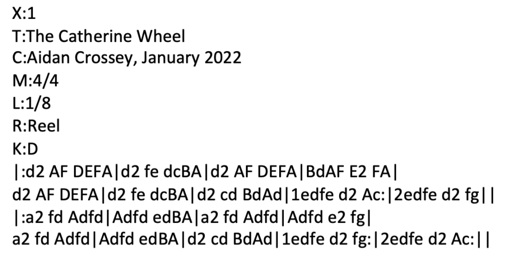 Added 23 January 2022. I was working on the embryonic version of this tune late last night when there was a sudden burst of fireworks from some eejits who live close by. Annoyed as I was at the intrusion into my peace and quiet, I am at least grateful that their lack of consideration gave rise to train of thought which eventually resulted in the title for this reel in D Major, The Catherine Wheel … Mandolin tab here. Listen to me playing The Catherine Wheel on my Paris Swing Macaferri mandolin. Listen to me playing The Catherine Wheel on my Ashbury AT-40 tenor guitar. ABC below: