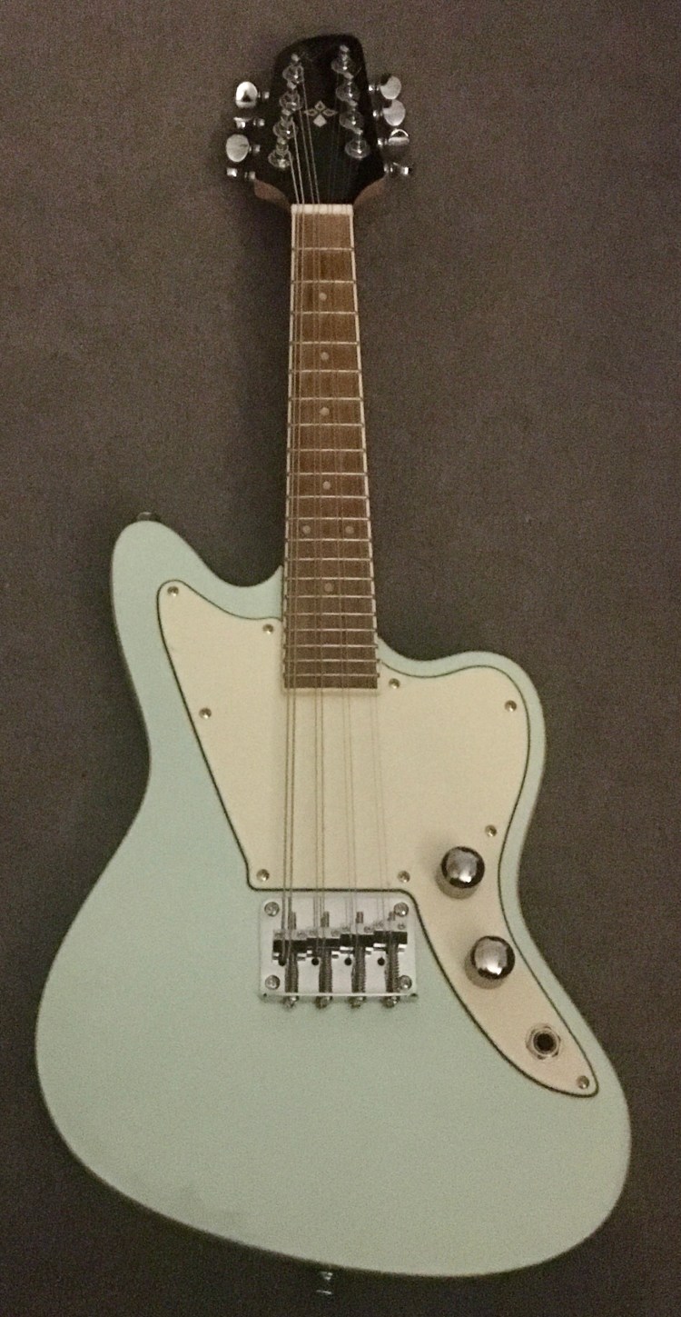 I bought a very cheap Chinese model – a Revelation electric mandolin in sea-foam blue, modelled on the Fender Jaguar. See pic below: