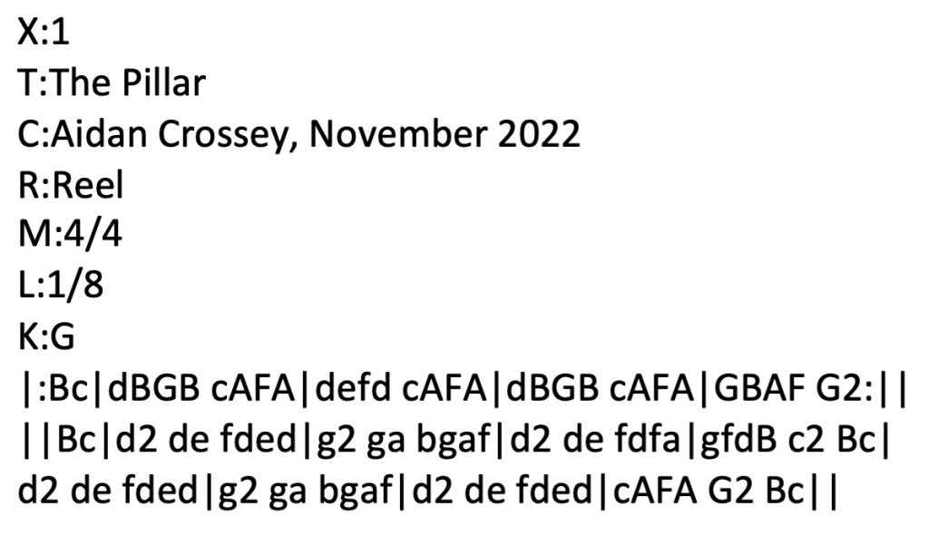 Added 5 May 2021. I’m surfing a creative wave at the moment. It’s been brought on by acquiring a new tenor guitar and somehow the difference and difficulty in navigating the bigger scale of what I jokingly call “an maindilín mór” (literally “the big mandolin”) has opened up possibilities that I may have glossed over in the past. Well, that and the fact that I have a lot of time on my hands and I rarely have a moment when I’m not playing one of my instruments. The following tune suggested itself last night while I was busying myself with my tenor guitar. I’d had a bit of an unsettling moment a little while earlier and I was a bit agitated. I often find that I’m at my most creative when there’s a disturbance in the force. This took me some time to get to the point where I was happy to say that it was finished and I believe that it may be among the most satisfying tunes I have written to date. (Certainly by the time I had finished it my earlier agitation had gone…)